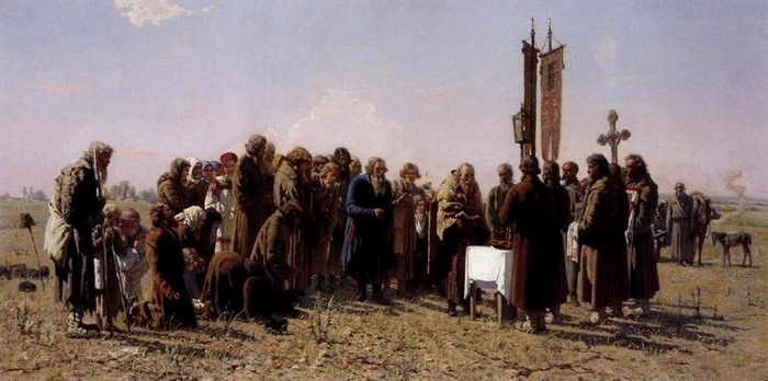 Суеверна душа народа-пахаря; но, и при всем заведомом суеверии, он -добрый сын матери-Церкви. Во всяком важном случае жизни привык обращаться он с горячей, из глубины сердца идущею молитвой к Богу. А что же для него может быть важнее всего, связанного с думой-заботой о хлебе. И приступает он к каждому своему новому труду в поле не иначе, как с благословения Божия. Приходит чудодейница-весна, пробуждается к новому плодородию Мать-Сыра-Земля... И вот тянутся от храмов Божиих в поле по всей Руси великой молебные ходы крестные. «Поднимаются иконы» народом и в засуху-бездождие, и в ненастье хлебогнойное.