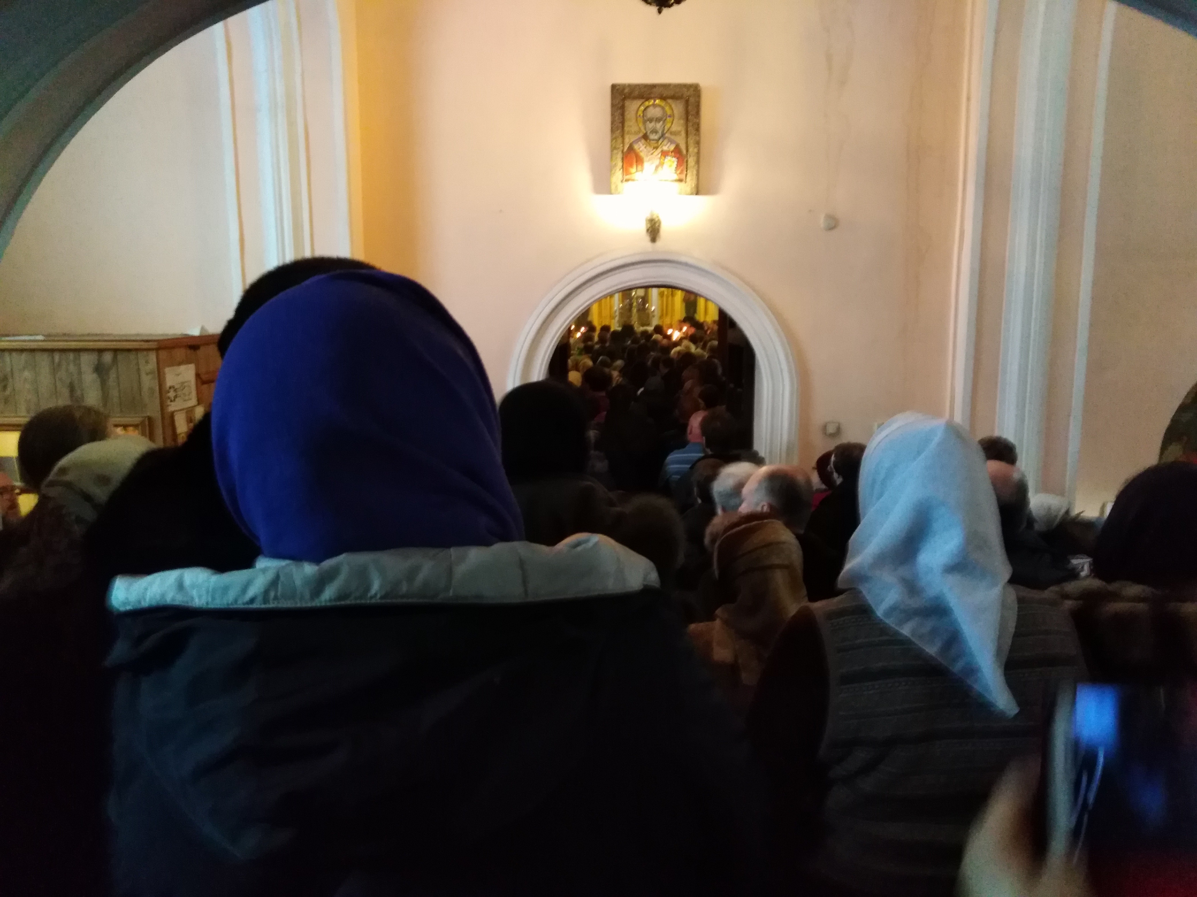 Внутрь нижнего храма было не зайти: народу — битком и в центральной части, и в обоих приделах. Службу стоял в притворе на лестнице, которая ведет в верхний храм. Там тоже было не протолкнуться.