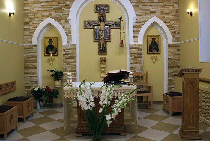 В центре на стене большое и очень красивое Распятие с предстоящими (кстати, ноги Спасителя пригвождены не одним гвоздём, как принято на Западе, а двумя – один из россыпей штрихов миссионерского плана). Перед Распятием единственная лампадка (она висела не строго по центру). Справа от Распятия образ католического святого Антония, слева – Франциска (благословляющие персты у них были сложены в двуперстии). Перед ними на подставках, по-видимому, реликварии с частицами их мощей. Ещё один образ над входными дверями – все они в византийском стиле. Скромный престол с двумя толстыми белыми свечами, ряды удобных лавок, маленький орган, деревянный потолок, слева от дверей ящичек с надписью «Просьбы св. Франциску».