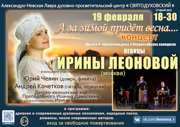 19 февраля в Свято-Духовском центре Александро-Невской Лавры состоится концерт «А за зимой придёт весна». Его откроет молодежный хор Преподобного Иоанна Дамаскина собора Владимирской иконы Божией Матери с участием учеников церковно-певческой школы Владимирского собора. Хор представит прекрасные древние византийские песнопения, посвященные Сретению Господню, и несколько хоровых композиций на слова русских поэтов своего художественного руководителя и создателя Ирины Болдышевой. Дирижировать будут также воспитанницы певческой школы Преподобного Иоанна Дамаскина.