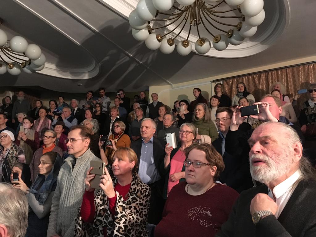 В-третьих, впервые за время своего совместного творчества (а это тридцать лет) Ж. Бичевская и Г. Пономарев спели вместе, да еще знаменитую песню о Святых Царственных мучениках. Эта песня-родоначальник их Царского цикла. Зал пел с ними «едиными устами» и «единым духом», соборным звучанием разнеслись имена наших любимых и драгоценных святых: Николай, Александра, Алексей, Мария, Ольга, Татьяна, Анастасия. Песня по сути стала НАРОДНОЙ, как многие песни этого творческого и супружеского союза. Заметила: на наших вечерах люди начинают петь! К ним возвращается эта вековая способность, присущая нашему народу. Финал вечера-песня МЫ-РУССКИЕ. Атмосферу зала и необычайный подъем людей хорошо передаёт даже запись с айфона.