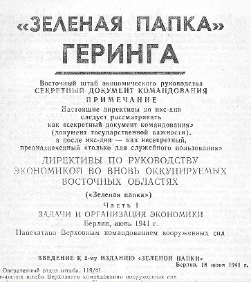 Ещё до подписания во 2-м издании директивы по «Зелёной папки», 16 июня 1941 года, Герман Геринг подписал 1 мая 1941 года Директиву о создании на всех оккупированных территориях (на всех, в том числе и западных – В.К.) особых штабов по выявлению, сбору и вывозу в Германию культурных ценностей. И не только. В «Зелёной папке» предписано в разделе «Сырьё и использование товарных ресурсов», что «1.Платина, магнезий, каучук должны быть немедленно собраны и как можно скорее вывезены в Германию. Хозяйственные учреждения должны дать соответствующие указания об исполнении…».