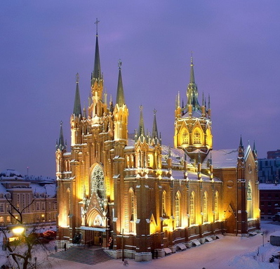 После значительного перерыва решил побывать у католиков (правильнее было бы называть их латинянами). Знакомые предупреждали: «Наверняка ведь что-то напишешь. Будь аккуратен, имей в виду, что согласно Баламандскому соглашению, мы с католиками - «Церкви - сестры». Памятуя, как много было людей в костеле св. Людовика, решил посетить кафедральный собор на Малой Грузинской улице - самый большой католический собор в России. Этот храм был построен за 10 лет в начале прошлого века. Архитектурными ориентирами для него были соборы в Вестминстерском аббатстве и Милане. Закрыли его в 1938 году. Вернули собор католикам в 1996 году.
