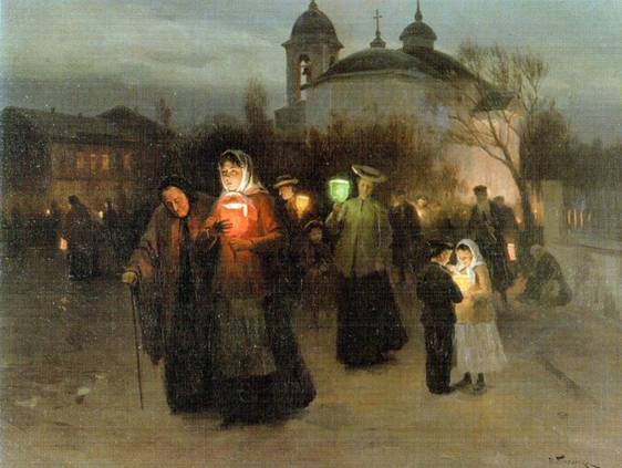А там - наступает и Святая, «великоденская», «славная» и «красная» неделя, на которую умильными голосами выводят, у церковных папертей сидючи, свой стих воскресный сохранившиеся исчезающим пережитком песенной народной старины калики перехожие: