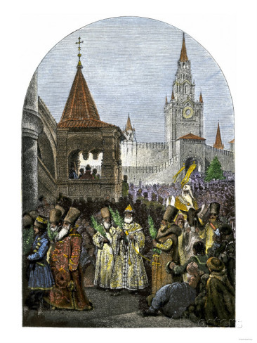Летописные сказания современников оставили нам яркую картину того, как совершался в XVII-м веке этот безпримерно торжественный благочестивый обряд стародавних дней, отмененный в 1700-м году - одновременно с упразднением на Святой Руси патриаршества. Раным-рано начинал стекаться в Вербное Воскресенье к стенам Кремля златоглавого царелюбивый и богобоязненный московский люд: всякому хотелось протесниться поближе к Успенскому собору, дабы удостоиться «пресветлаго царскаго лицезрения». Отстояв у себя на Верху (в своих палатах) раннюю обедню, шел царь-государь в этот храм Божий - в своем праздничном выходном наряде. Державного хозяина Земли Русской окружал многочисленный сонм бояр; шли обок с ними окольничие и прочие чины. Из соборных дверей, спустя малое время, показывались хоругви, кресты, рипиды и иконы; шли между ними, по двое и по трое в ряд, чернецы, диаконы и священники. Следом за соборными иконами выступали успенский с благовещенским протопопы, а за ними - певчие, поддьяки, ключари и, наконец, патриарх в малом облачении. Обок с владыкою-святителем шли диаконы, неся - справа от него Святое Евангелие, слева - «на мисе крест золотой, жемчужный, большой да малое Евангелие». Вся священнослужительствующая Москва шла в патриаршем крестном ходу, - да не только Москва, а духовенство иных городов русских. Шествие царя-государя было не менее блестяще. Открывалось оно нижними чинами, за которыми выступали дьяки, дворяне, стряпчие, ближние и думные люди и окольничие. За последними шествовал сам венценосный богомолец. Замыкали ход бояре в богатых шубах и высоких горлатных шапках, ближайшие из ближних людей, гости, приказные, иных чинов люди и народ. Весь путь - с обоих боков - оберегали полковники стрелецкие в бархатных и объяринных ферезеях и в турских кафтанах. Возле них - также по обе стороны - шли стрельцы стремянного полку, «в один человек»: сотня с золочеными пищалями да полусотня с батожками и прутьями. За стеною стрельцов были расставлены пестрые кадки с пучками вербы, предназначавшейся для раздачи народу московскому. Оба шествия останавливались пред Покровским собором - «лицом к восходу солнечному». Царь со святителем вступали во Входо-Иерусалимский придел в сопровождении высших чинов государевых и духовенства. По обе стороны лобного места становилась вся остальная свита государева со стольниками во главе. В соборном приделе, между тем, начиналось молебствие. Во время него облачался патриарх; государь же возлагал на себя большой наряд царский еще на паперти. Во храм Божий вступал царь в «платне» из золотной ткани, отороченном жемчужным узорочьем, усыпанным каменьем самоцветным. Над челом самодержца сверкал драгоценной осыпью - алмазами, изумрудами да яхонтами - венец царский, соболем опушенный. Рамена государевы были покрыты бармами, именуемыми «диадимою»; на груди сиял Крест Животворящего Древа. Царский посох сменялся на златокованный жезл, изукрашенный богато, каменьями осыпанный. Лобное место к этому времени устилалось-убиралось бархатами да сукнами, да камкою. На возвышавшемся на нем аналое, укрытом пеленою впразелень, возлагалось Святое Евангелие, окружавшееся иконами. Путь отсюда к Спасским воротам кремлевским ограждался обитыми красным сукном надолбами-решетками. Вся Кремлевская площадь представлялась морем голов и пе