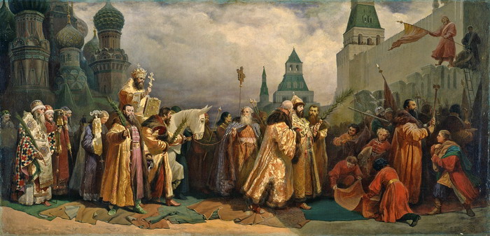 Седмице Страстей Христовых предшествовал в старину на Москве Белокаменной торжественный обряд «шествия на ослята», знаменовавший воспоминание о евангельском событии - Входе Господнем во Иерусалим. День, посвященный празднованию этого великого события, как и в настоящее время, носил на Руси название Вербного Воскресенья. Начало сведений о совершении названного обряда должно отнести к XVI-му столетию, времени - когда, под властной рукою царей, только что начала слагаться в стройный уклад самобытная жизнь московской Руси. Умилительное для русского сердца и поразительное для иноземных гостей зрелище представлял этот крестный ход во главе с патриархом, восседавшим на «осляти» (коне в белом суконном уборе), ведомом рукою венценосного богомольца - царя-государя всея Руси, возлагавшего на рамена свои - вместе с бармами - истинно-христианский подвиг смирения.