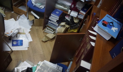 Когда наши сотрудники вошли в офис, то их глазам открылась картина настоящего погрома. На полу и на столах были разбросаны и смешаны рукописи, книги, разные предметы. Всюду торчали провода от унесенных, ранее связанных друг с другом компьютеров и других электронных приборов, сами компьютеры полиция увезла. Дверцы и ящики, которые были заперты на ключ, вырвали «с мясом». Все дверцы были распахнуты настежь, содержимое полок было либо перевернуто, либо сброшено на пол. Конечно, все эти «картины» мы немедленно сфотографировали. В этом грубом осквернении нашего офиса пришельцами чувствовалсякакойто вызов и даже выпад.