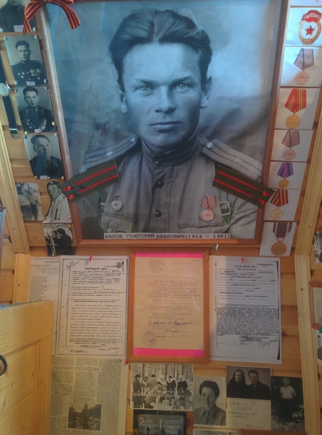 Немало материалов экспозиции посвящено истории Великой Отечественной войне, блокаде Ленинграда. Это и понятно, ведь родители Александра - писатель, офицер-фронтовик Григорий Иванович Раков и блокадница Вера Григорьевна Сироткина. Трогательна история их встречи и любви. Они познакомились совсем юными в Хибинах. Листая книгу Г.Ракова «Хибинские клады», читаем дарственную надпись: «Самый дорогой для меня хибинский клад - ты, моя любимая страница жизни. Хибины соединили нас на всю жизнь... Дарю тебе, Вера, эту книгу, которая воскресит в нашей памяти дни нашей юности. 15. 01. 77. Г.Р.»