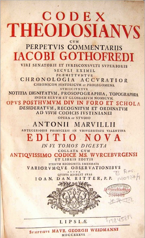 Кодекс Императора Феодосия I — Codex Theodosianus — первое официальное собрание законов Римской Империи. Издание 1736 года