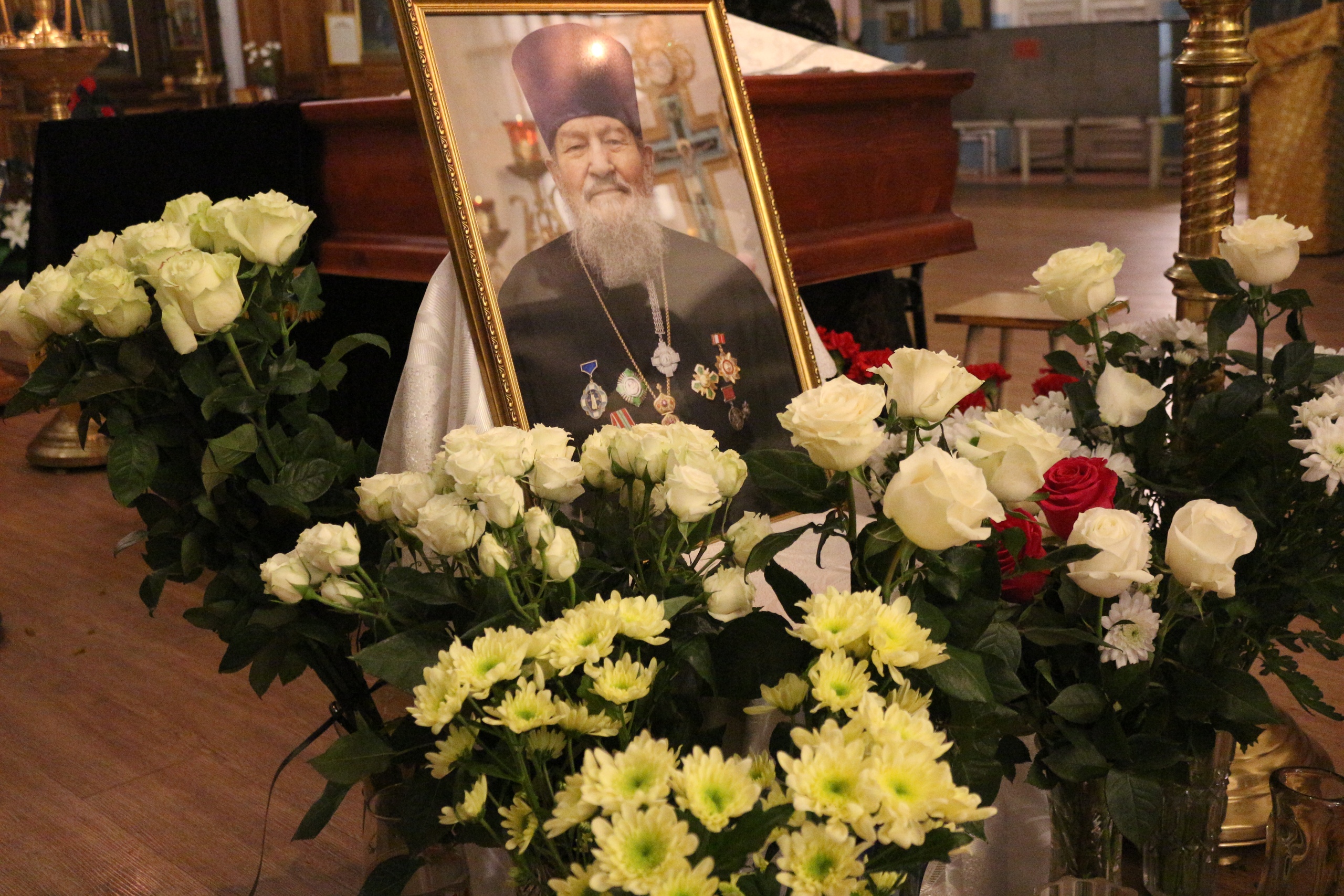 7. Портрет с наградами на груди о. Анатолия у его гроба в центре храма