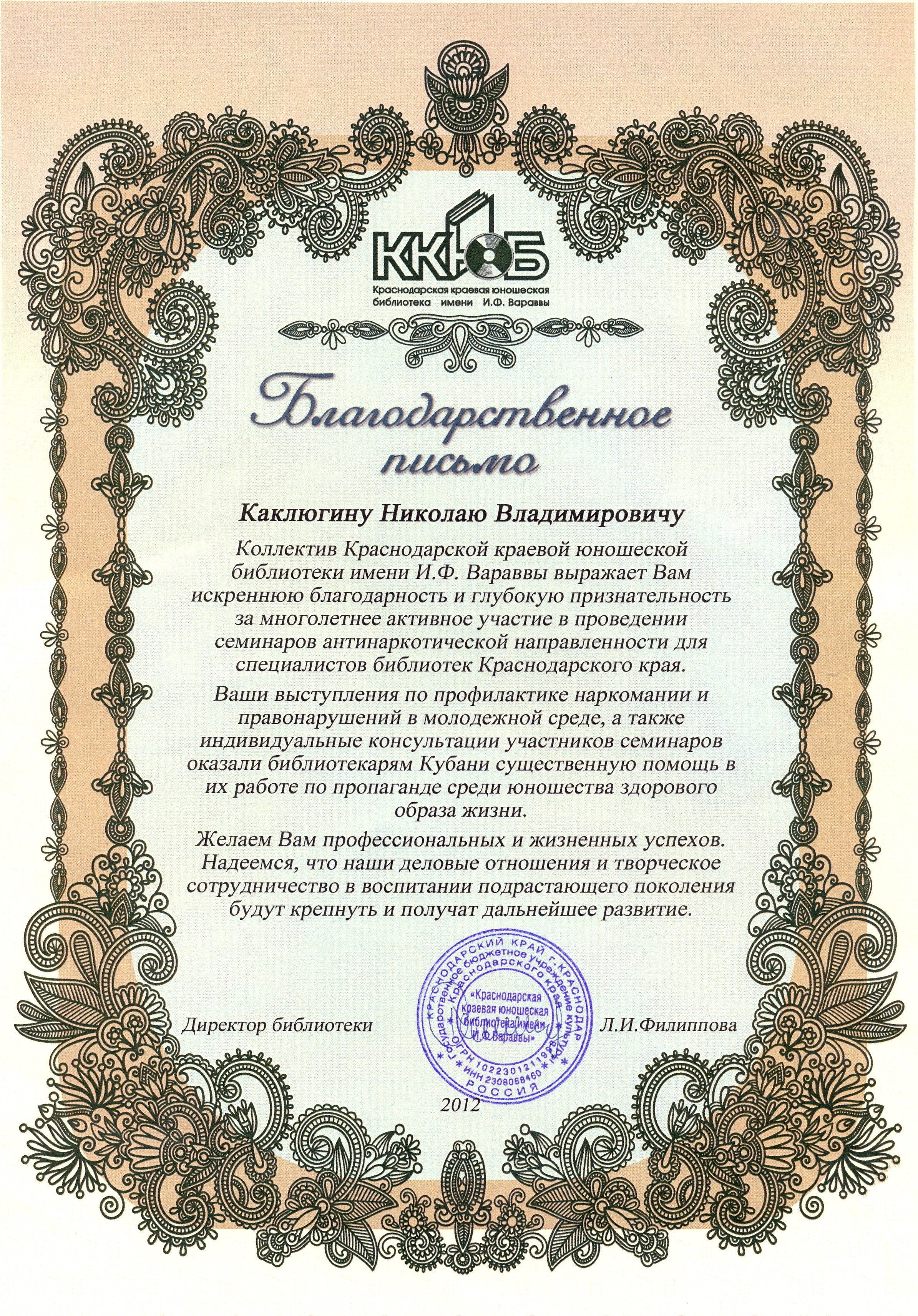 Особо отмечаю высокий научно-практический уровень и актуальность представленного Вами доклада по теме “Проблемные вопросы и базовые механизмы реабилитации, псевдореабилитации (вербовки) и ресоциализации химически зависимых лиц”.