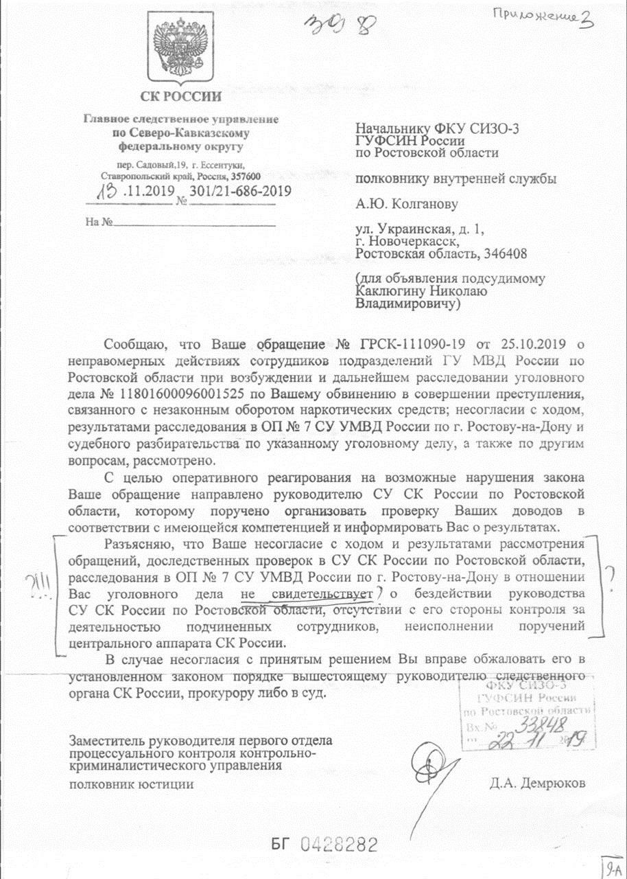 Вообще абсолютно полное игнорирование со стороны прокуратуры всех этих трёх моментов. Ни областная, ни Пролетарского района… Всё это зачтено, всё это считается. И лжец Пачганов начальник [областной медсистемы ФСИН России, ФКУЗ] МСЧ-61 пишет, что у меня состояние удовлетворительное... Да это кошмар у меня был вообще! 34-й день первой голодовки, 13-й день второй голодовки. Я не могу понять, как это может быть? Это фашизм. Просто фашисты!!! [Подзаголовок материала первой части аналитики подзащитного «Следствие ведут знатоки… подтасовок по “делу Каклюгина”» так и называется «Русский фашизм Ростовской полиции»:
