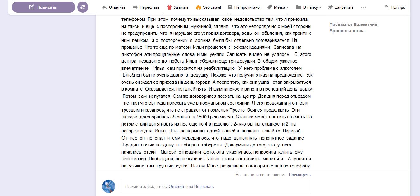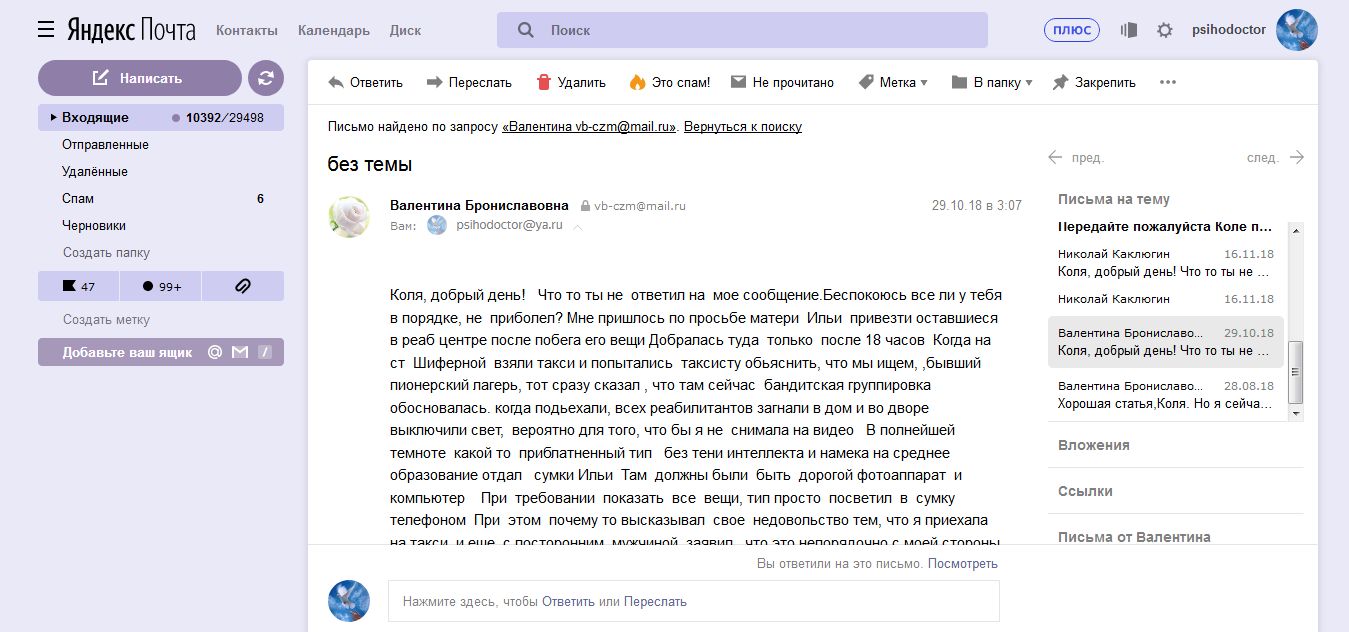 А уже когда я находился здесь, 29 октября [2018 года], на мою электронную почту поступило письмо от матери Любови Лушниковой [Валентины Брониславовны Райковой], в котором она сообщила, я прошу приложить скриншоты.