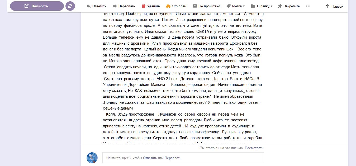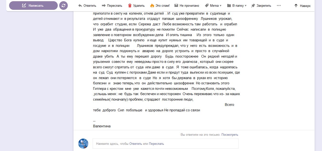 А дословно.., значит, что она написала, цитирую [пропуская вступление и текст о другом]: «Коля будь поосторожнее, Лушников со своей сворой ни перед чем не остановятся. Андреич (это «епископ» Бритвенко, руководитель «Царства Бога», который пришёл сюда в Россию под брендом «Центр здоровой молодежи», потом антинаркотический союз Национальный) угрожал мне перед разводом Любы, что её заставят приползти в секту на коленях, отняв детей. И суд уже превратили в судилище». Это суд по детям, который мы тоже здесь обсуждали. Лушникова [Любовь – свидетель обвинения] рассказывала [при допросе на судебном заседании 16.07.2019 г.] об этом суде, и Павлюченкова говорила [в своих показаниях 02.04.2019 г. и 23.04.2019 г.], что я участвовал в этом судебном процессе, с кем будут воспитываться дети, это всё есть в показаниях, я тоже должен это пояснить. «И суд превратили в судилище», - пишет мать Любы Лушниковой мне на почту, когда я уже 29 октября находился в СИЗО. «И детей отнимают и в результате отдадут папаше шизофренику. Лушников угрожал, что ограбит студию, если Серёжа (это брат Любы) даст Любе возможность (Лушниковой) там работать, и ограбил. И уже два обращения в прокуратуру не помогли.../…/… Из этого только один вывод: “Царство Бога” купило и ещё купит нужных им товарищей и в суде, и в Госдуме, и в полиции. Лушников предупреждал, что у него есть возможность и в дом наркотики подкинуть, и аварию на дороге устроить, и просто в случайной драке убить. А ты ему перешёл дорогу. Будь поосторожнее. Он редкий негодяй и угрызения совести ему неведомы просто в силу его диагноза, который они скорее всего смогут спрятать от суда или даже в суде…/…/… Суд куплен с потрохами». Это имеется в виду не этот, а гражданский суд, который был по детям... «Даже если и придут туда выписки из всех психушек, где он лежал, они потеряются в суде». Имеется в виду муж Любы Лушниковой – Никита Лушников. «Но я хотя бы держала в руках его историю болезни и знаю теперь, что он действительно шизофреник. Но остановить этого Гитлера с крестом мне уже кажется почти невозможным. Поэтому, Коля, пожалуйста, услышь меня: не будь так беспечен и неосторожен. Очень переживаю, что из-за наших семейных (поначалу) проблем страдают посторонние люди. Всего тебе доброго. Сил побольше и здоровья. Не пропадай со связи».