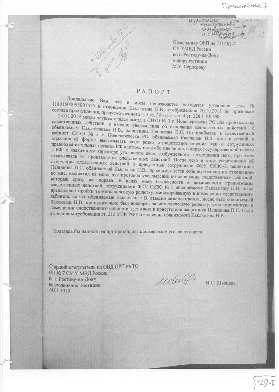 «Опрошенные в ходе проверки сотрудники ОСН “Гром” пояснили, что в октябре 2018 года в отряд поступило задание на оказание силового сопровождения оперуполномоченным УКОН ГУ МВД России по Ростовской области Скогореву Д.Г. и Болдыреву А.В. [первая опечатка в инициалах Болдырева: на самом деле он А.Ю., а не А.В.]. Согласно заданию необходимо было задержать гражданина по фамилии Каклюгин Н.В., подозреваемого в совершении преступления, но какого именно они не запомнили. Все сотрудники ОСН “Гром” были одеты в гражданскую одежду в связи с условием задания. Они рассредоточились на позициях, и примерно в период с 20:00 до 22:00 и по команде оперативных сотрудников, когда Каклюгин Н.В. вышел из кафе “Ялла”, с ним была женщина и они пошли по аллее парка “Октябрьской революции” в сторону ул. Каяни, они вчетвером подошли к Каклюгину Н.В., представились, на что Каклюгин Н.В. резко попытался одного из них оттолкнуть, но не смог этого сделать и был ими повален на землю, и на него были надеты наручники. Далее Каклюгин Н.В. был помещен на заднее сиденье служебного автомобиля Лада-Приора, куда также присели оперуполномоченные Скогорев Д.Г. и Болдырев А.В. [вторая опечатка в инициалах А.Ю. Болдырева: уже наводит на размышления – кто же там был на самом деле?], и один из них был за рулём, отъехав от места задержания несколько метров в проулок, после чего один из оперуполномоченных пригласил двоих мужчин в качестве понятых для проведения личного досмотра Каклюгина Н.В. В досмотре сотрудники ОСН “Гром” не участвовали, поэтому комментировать им нечего, но они видели, что по факту были выложенные свёртки на полке багажнике автомобиля. [“На полке багажнике” – очень похоже на то, что изначально было записано “на багажнике“, а потом стали исправлять, согласно “легенде” для фальсификации, на фразу - “на полке багажника”, но недоисправили и осталось “на полке багажнике”]. Далее, данные свёртки были изъяты и упакованы в пакет. Также были досмотрены личная сумка, находящаяся при Каклюгине Н.В., внутри которой была обнаружена пластиковая банковская карта “Сбербанк”, которая также была изъята и опечатана вышеуказанным способом, после чего во второй сумке, находящейся при Каклюгине Н.В. был обнаружен ноутбук вместе с зарядным устройством и мобильный телефон, которые также были изъяты и упакованы. Затем с обеих ладоней и пальцев рук Каклюгина Н.В. на влажную спиртовую салфетку были произведены смывы, которые вместе с контрольным образцом спиртовой салфетки были помещены в полимерный пакет и опечатаны. После чего Каклюгин Н.В. в их сопровождении был доставлен в ОП №7 УМВД России по городу Ростову-на-Дону, где они пробыли недолгое время и уехали. Никто морального и физического, а также психологического воздействия на Каклюгина Н.В. не оказывали, наркотические средства ему никто не подбрасывали. [Сразу вопрос возникает – как это они могут утверждать, что “наркотические средства ему никто не подбрасывали”, когда только что, чуть выше в показаниях, сами же утверждают: “В досмотре сотрудники ОСН “Гром” не участвовали, поэтому комментировать им нечего”]. Во время задержания у Каклюгина Н.В. мобильного телефона марки “iPhone 6S” я не видел, также не видели, чтобы какие-либо мобильные телефоны выпадали из карманов Каклюгина Н.В. во время задержания». [Все показания сотрудников ОС