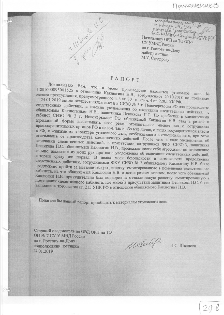 Адвокат Пешиков П.С.: И в итоге также стороне защиты стало известно о заявлении Разумной Натальи Николаевны, которое также указывал и цитировал Каклюгин в своих показаниях [см. часть 1 выступления на судебном заседании 03.10.2019 г. по ссылке], на трёх листах. Имеется штамп входящей корреспонденции прокуратуры Ростовской области от 22 августа 2019 года. В связи с чем просим копию приобщить к делу. [Отсканированные листы данного заявления подполковника полиции Н.Н. Разумной см. в статье Н.В. Каклюгина «В группе риска по безопасности и здоровью»]