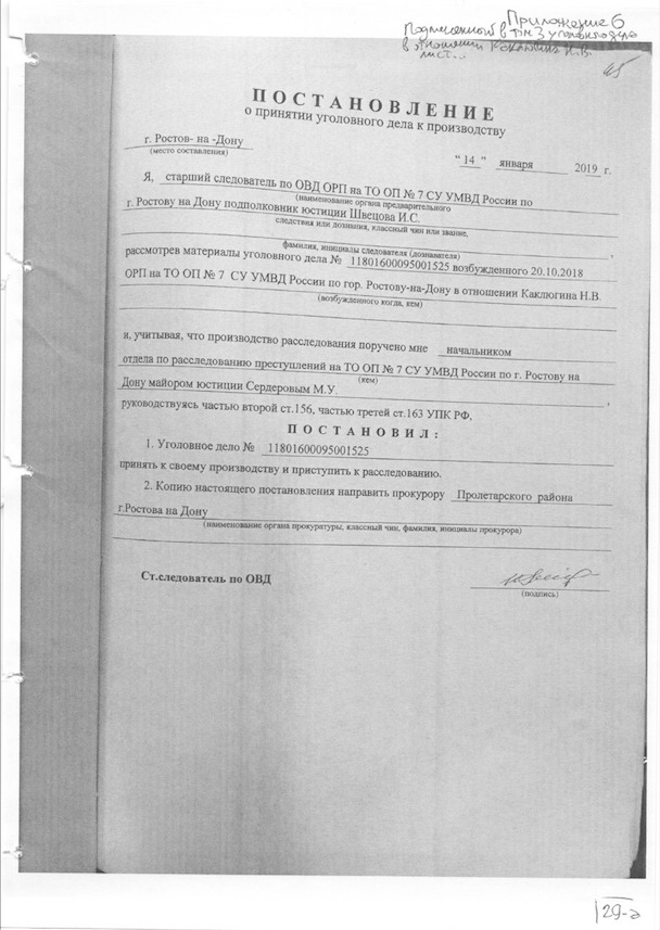Просим также приобщить копию, сделанную путём фотографирования снимка [из материалов уголовного дела №11801600095001525]. Это лист №45, в верхнем правом углу имеется запись. Также это рапорт старшего следователя Шевцовой И.С., который стороной защиты был сфотографирован в момент ознакомления, но на данный момент в материалах, которые были исследованы уже в судебном заседании, под №45 третьего тома имеется Постановление о принятии к производству Швецовой [настоящего уголовного дела] после создания следственной группы. Просим данные снимки приобщить. [См. Приложения 6-9].