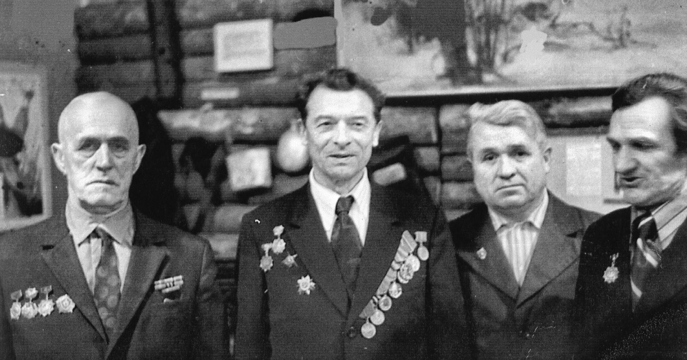 П.В. Бобрусь с бывшими партизанами Ленинского отряда Я.К. Кирилловым (слева), В.И. Жарковским и бывшим командиром отряда им. Александра Невского В.И. Поповым (крайний справа). Фото 70-х гг.