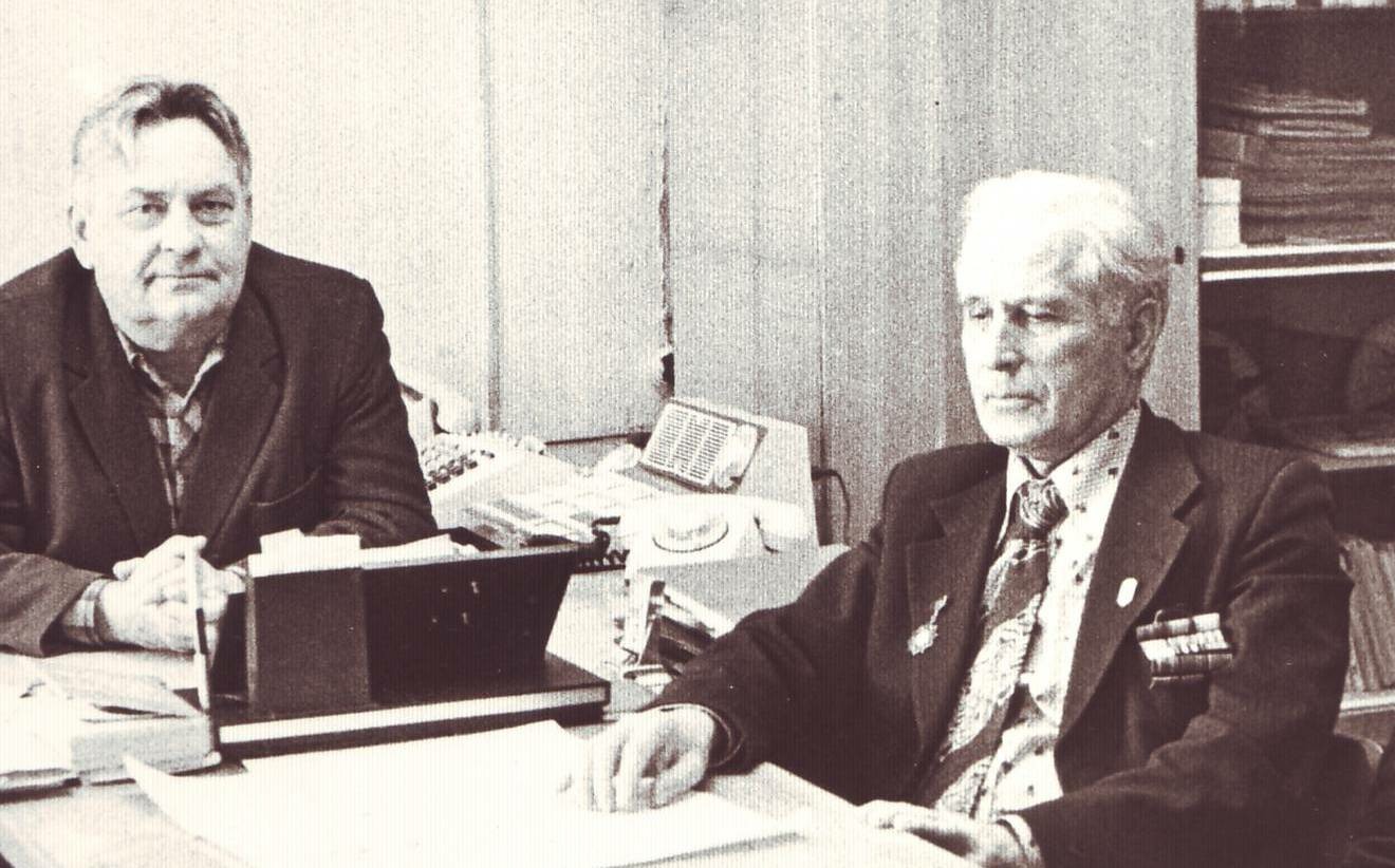 Г.М. Зайцев (справа) и директор Западнодвинского ДОКа, бывший разведчик 10-й Калининской партизанской бригады В.А. Боровков. 80-е гг.;
