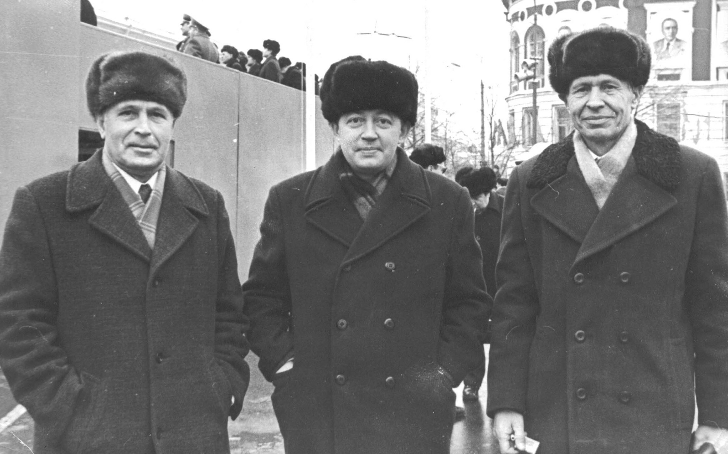 (слева направо) Г.М Зайцев, писатель В.Я. Кириллов; бывший командир 1-й и 4-й Калининских партизанских бригад Ф.Т. Бойдин. 80-е гг.