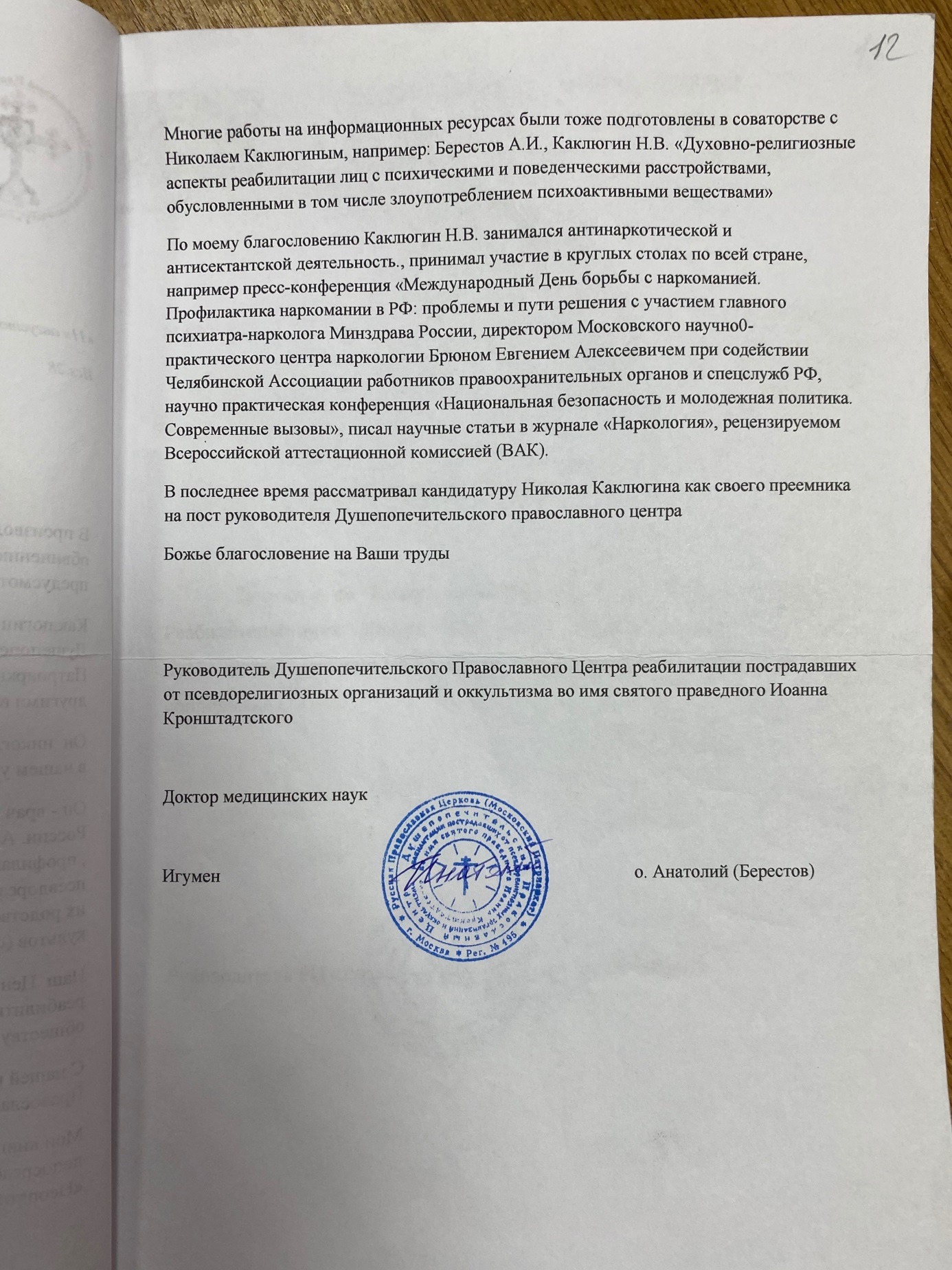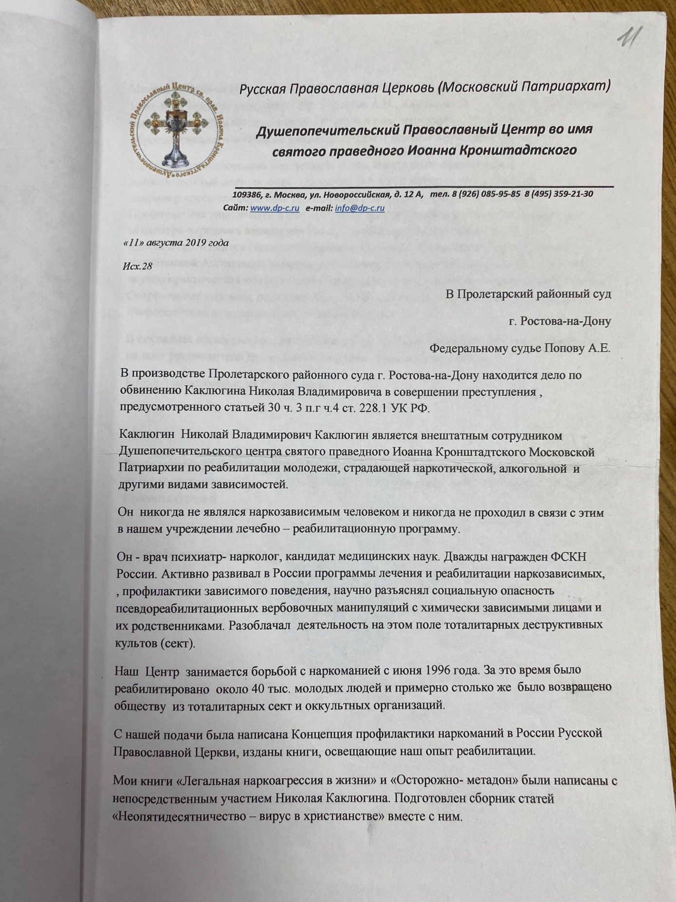Каклюгин Н.В.: Одну фразу. Отец Анатолий Берестов: «Он [Каклюгин Н.В.] никогда не являлся наркозависимым человеком и никогда не проходил в связи с этим в нашем учреждении лечебно-реабилитационную программу». Вот эти слова, чтобы они были для протокола.
