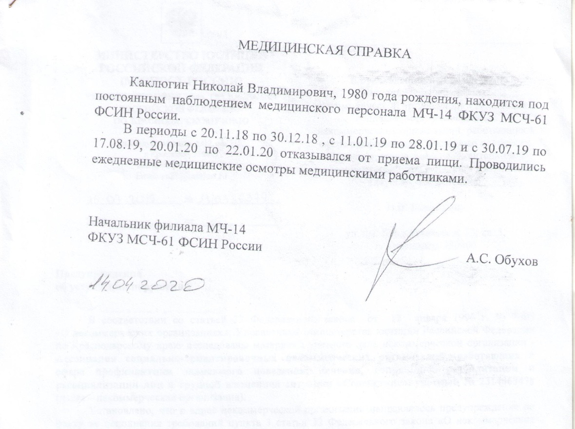 Каклюгин Н.В.: (зачитывает фрагмент) «Николая Каклюгина заключили под стражу, трижды он объявлял голодовку, требуя, чтобы его дело передали на рассмотрение в центральный аппарат Следственного комитета России. Когда состояние здоровья врача ухудшилось, его перевели в тюремную больницу, при этом поместили в психиатрическое отделение вместо [назначенного] терапевтического». [Продолжение справки адвоката Пешикова П.С. от 10.12.2019 г.]. Весной 2019 года меня поместили в психиатрию вместо терапии. Понимаете? В конце апреля. Это было… – меня чуть не убили там, там была верёвка на решётке [окна]. Почему прокуратура Ростовской области не проверяет этот факт? Я говорю – меня чуть не убили, это сговор. Понимаете? Там верёвка висела, меня поместили в психиатрию вместо терапии…