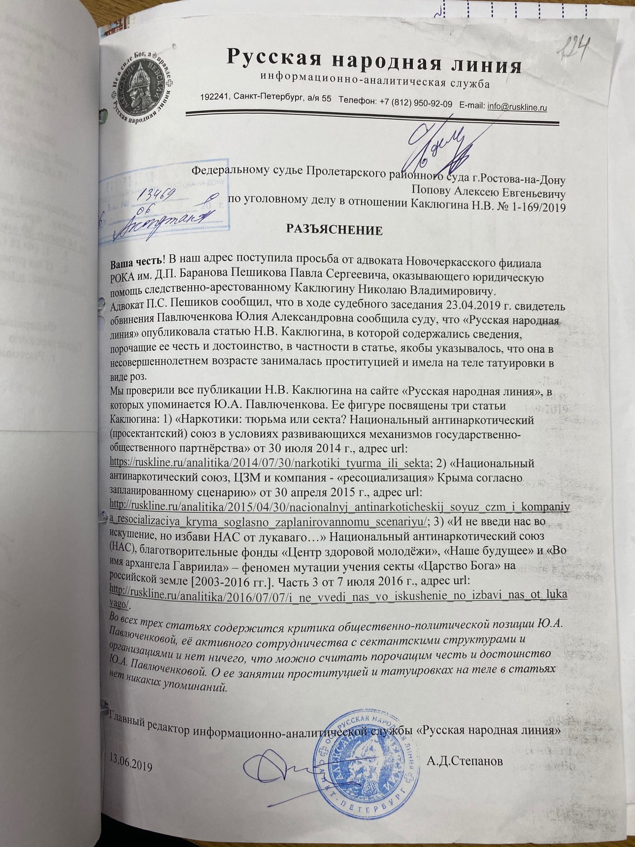 Третье было, мне было предъявлено со стороны Павлюченковой, что я, якобы, публиковал материалы, то, что она в юности занималась проституцией – это тоже всё относится к Павлюченковой. Однако, «Русская народная линия» [редакция, на которую ссылалась Павлюченкова, когда сообщала ложные сведения, что Каклюгин Н.В., якобы, размещал на их интернет-ресурсе материалы о её занятии проституцией] предоставила 13.06.2019 г. справку, что я только публиковал материалы о связях её с Национальным антинаркотическим союзом, который в свою очередь связан с харизматической сектой «Царство Бога».