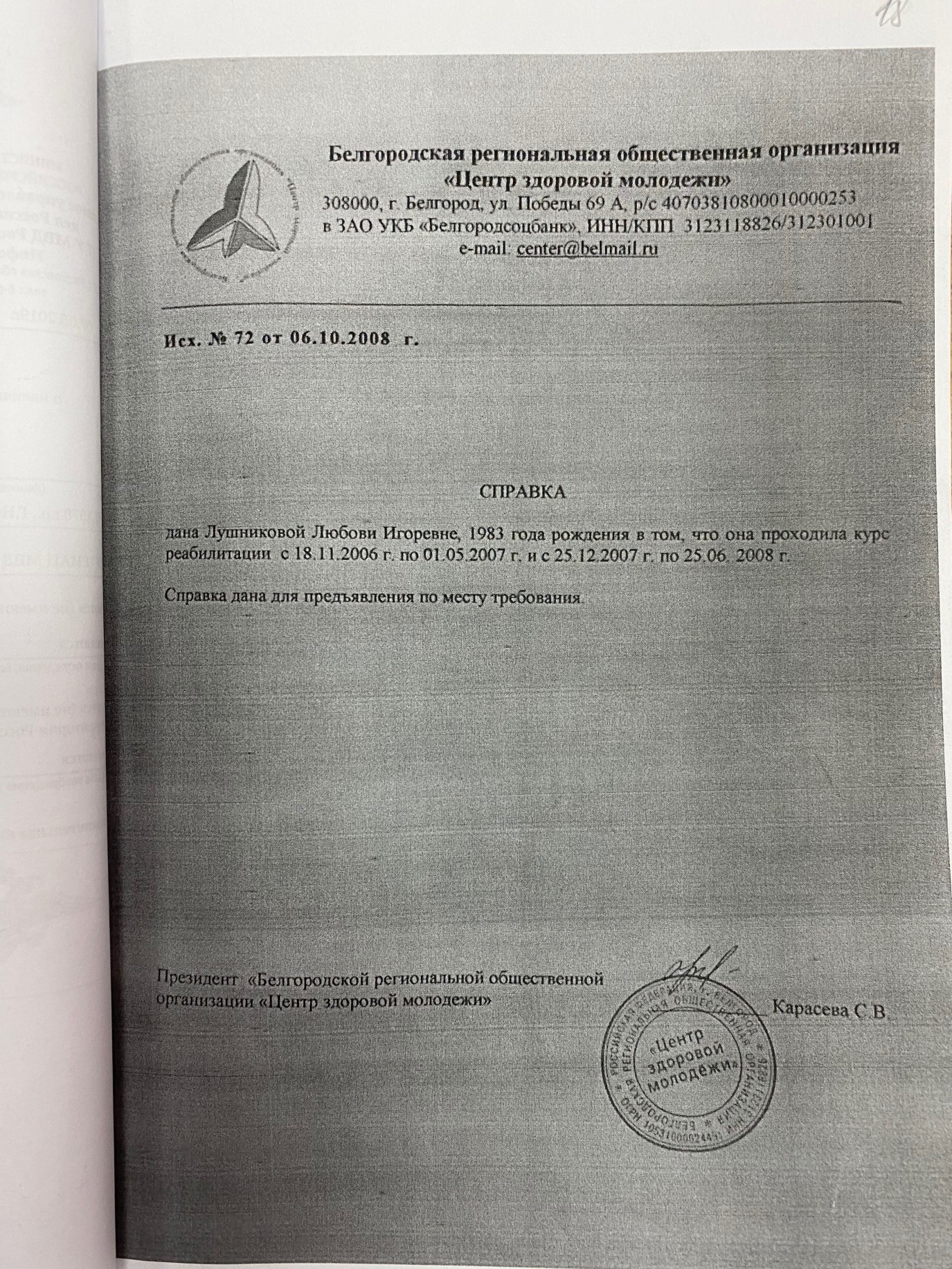 Я хотел, вот ещё справка о том, что она проходила реабилитацию с 18.11.2006 г. по 01.05.2007 г. [и с 25.12.2007 г. по 25.06.2008 г.] – по поводу Лушниковой, то есть о том, что она наркозависима, что уже – её показания уже подвергаются сомнению, это уже говорит об этом. [См. том №5 материалов судебного дела, лист 18, справка выдана президентом Белгородского регионального отделения “Центр здоровой молодежи” Карасевой С.В. 06.10.2008 г., исх. №72].