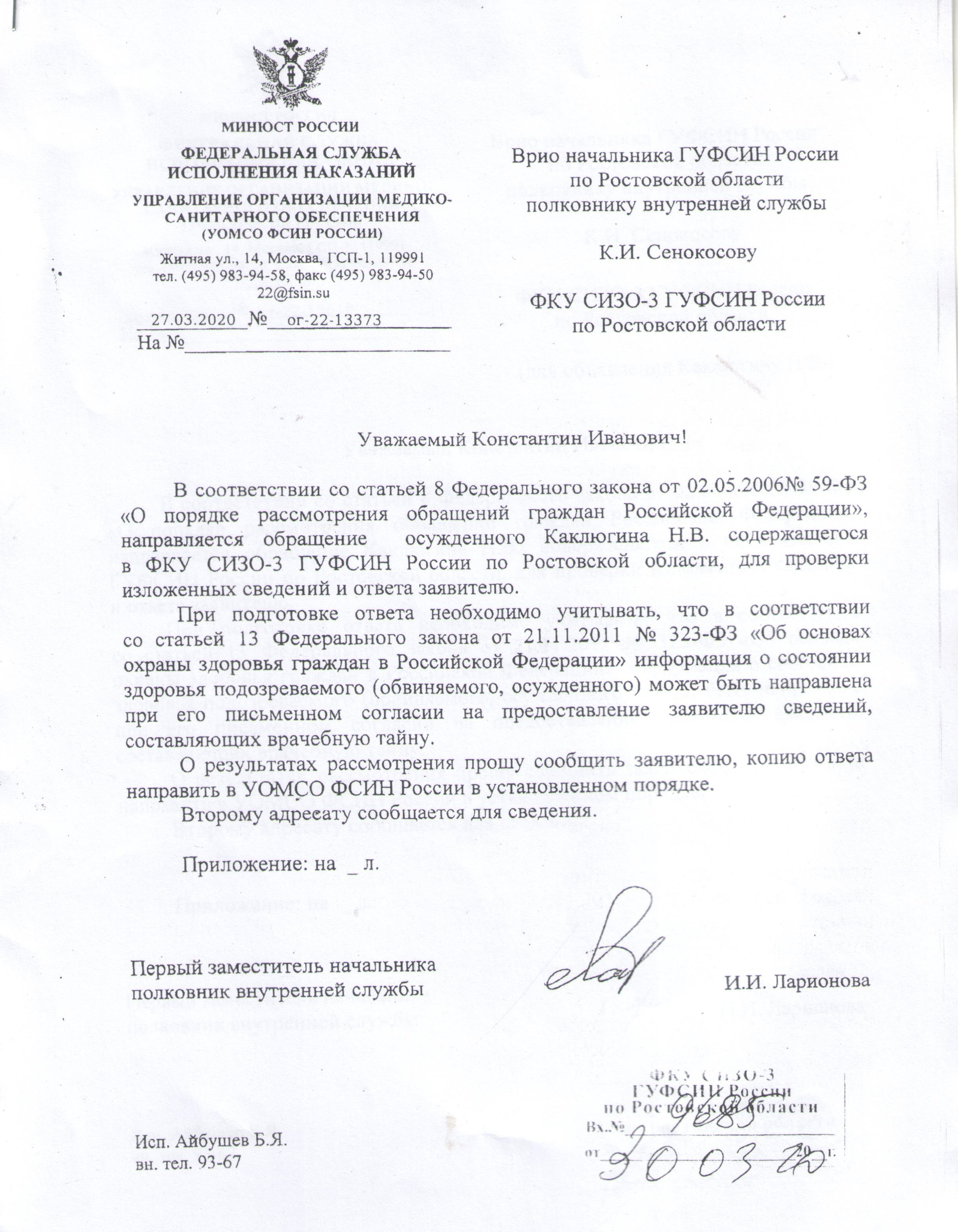 Направлено вр.и.о. начальника ГУ ФСИН России по Ростовской области К.И. Сенокосову с требованием проверить изложенные сведения и ответить мне, копию ответа направив в УОМСО ФСИН России.