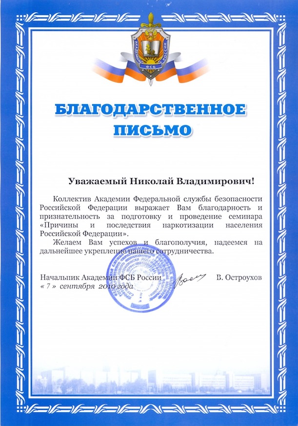 Я дважды награждён от ФСКН – почётной грамотой и почётным нагрудным знаком – от ФСКН лично, от директора ФСКН России получал эти награды.