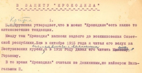 Н.К. Крупская утверждает, что в моем «Крокодиле» есть какие-то антисоветские тенденции.