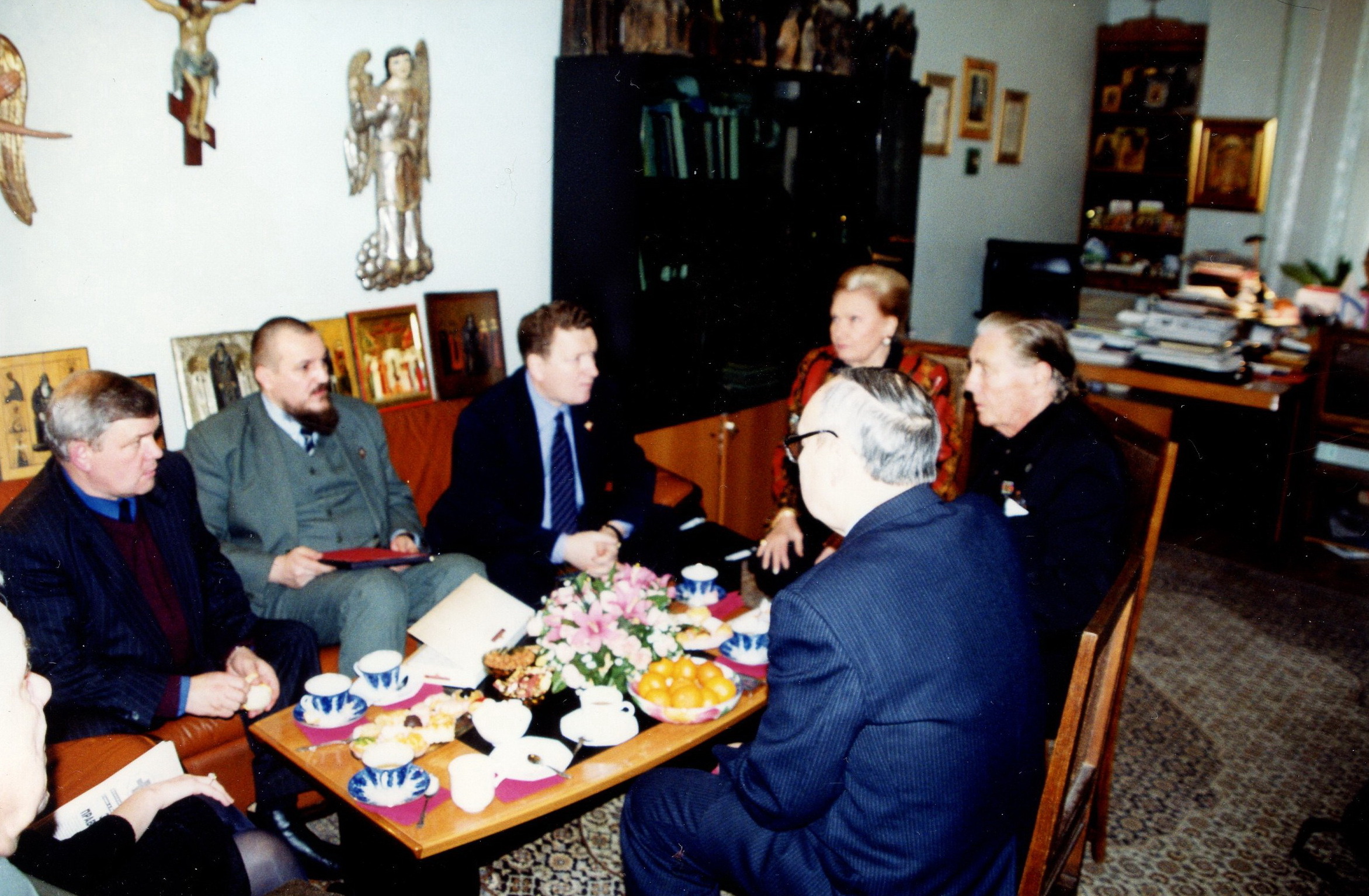 Резиденция Святейшего Патриарха, Чистый переулок, 5. С двумя моими помощниками прибыли за несколько минут до назначенного на 14 часов срока, но были сразу же приглашены в покои, где во время ожидания рассматривали выставленную на небольшом стенде коллекцию современных церковных наград. В 14 часов 15 минут одна из монахинь-послушниц пригласила нас в рабочий кабинет Патриарха, в котором Святейший впервые принимал меня в 1992 году — ровно шесть лет назад. Патриарх благословил нас и пригласил садиться за небольшой инкрустированный стол, сам же расположился на стуле напротив меня. После обмена первыми приветствиями разговор продолжается ровно час в духе взаимопонимания и благорасположения.