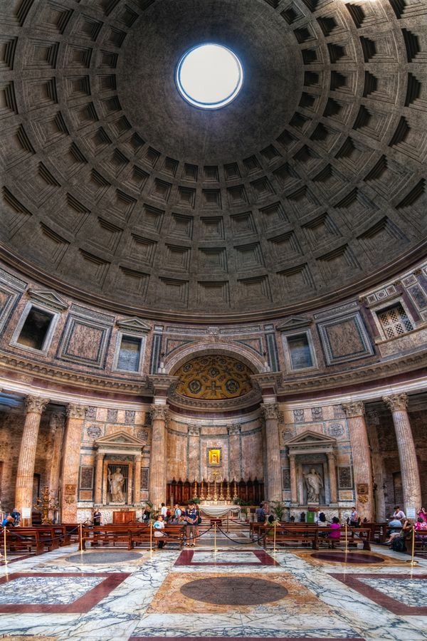 Попав в сам храм, начинаешь ощущать себя букашкой, настолько впечатляют и подавляют масштабы. Купол – это отдельная песня, аналогов ему нет в мире. Огромная полусфера диаметром внутри более 43 метров с круглым 9-ти метровым отверстием в центре – через него внутрь попадает свет, "столб света", а в католический праздник Пятидесятницы прихожан храма сквозь отверстие осыпают лепестками красных роз ("Сошествие Святого Духа"). Пускают на эту службу только 300 человек. Это световое окно (окулюс) имело мистическое значение для всех религий: купол – небо, а отверстие - место сошествия божеств. Пантеон стал христианским с 608 года. У христиан окулюс - это "Око Господне". Экскурсовод с упоением рассказала нам об удивительном совпадении: при строительстве еще в начале 2 века было рассчитано так, что свет из окулюса в полдень озарял арку над центральным входом два раза в год - 4 сентября (в честь одного из важных божеств римского пантеона – Юпитера) и 7 апреля – в честь женского божества Манья Матер. Солнечная арка на православное Благовещение – на это стоит посмотреть! Кстати Пантеон сейчас является храмом Святой Марии и Мучеников. В нишах стен, отделанных мрамором, устроены часовенки (капеллы).