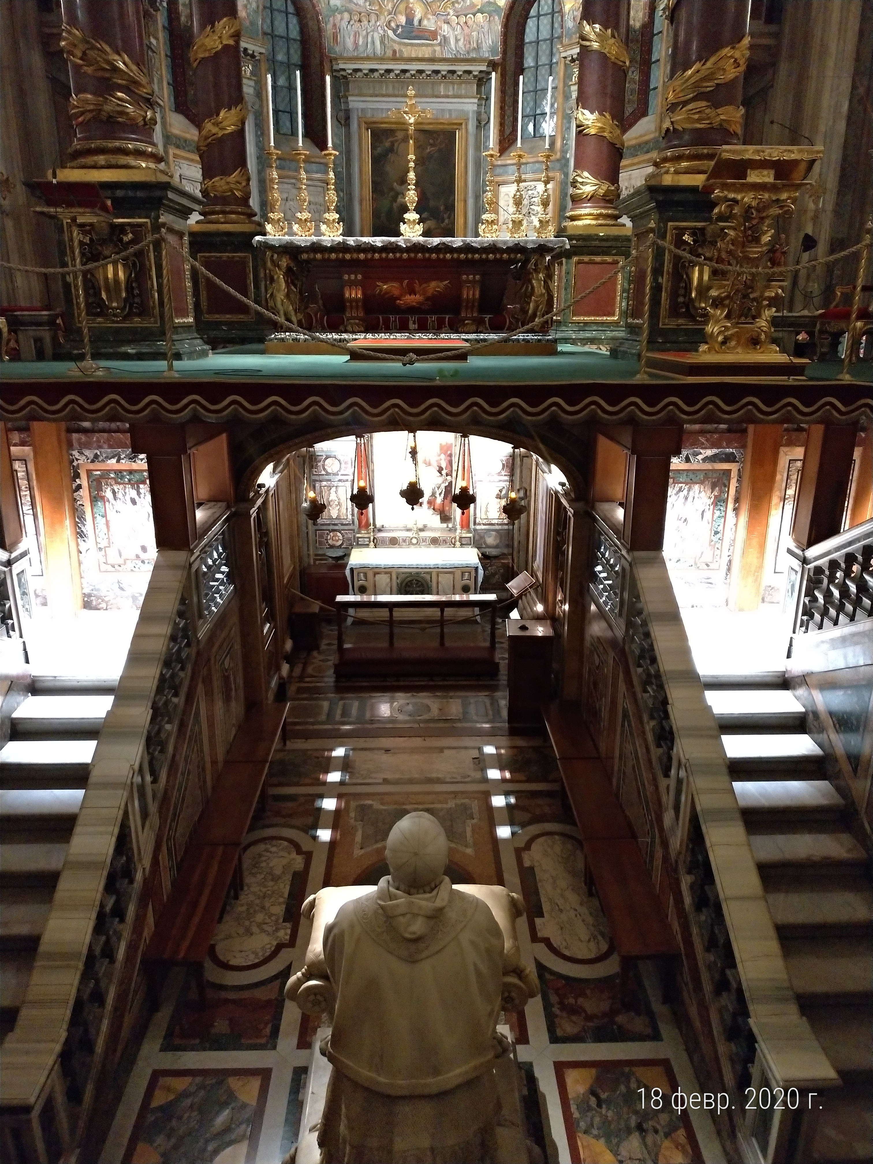 В первый же день побывали в одном из четырех главных (великих) храмов Рима – Латеранской папской базилике (Собор Святого Иоанна Крестителя на Латеранском холме или Базилика Сан-Джованни-ин-Латерано). Над входом надпись, что это «святейшая Латеранская церковь, всех церквей города и мира мать и глава». Т.е. ее статус итальянцы поднимают выше всех храмов не только Рима (даже собора св. Петра), но и мира. В этих стенах прошло пять Латеранских Вселенских соборов Католической церкви. Здесь кафедра римского епископа, папский трон. На главном престоле, находящемся под балдахином, служит только Папа.