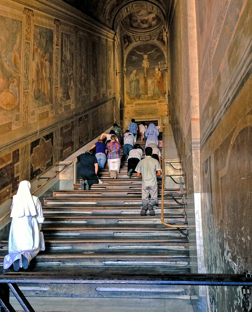 Считается, что взойдя по 28 ступеням Святой лестницы с молитвой и смирением в сердце, человек может получить отпущение грехов. Чтобы подняться на коленях по священным ступеням, в Рим ежегодно приезжают тысячи паломников из разных стран мира. Католики на каждой ступени читают специальные 28 молитв; православные - «Отче наш» или на протяжении всего пути читают Акафист Страстям Христовым. Со временем ступени стали стираться. Чтобы сохранить реликвию, их покрыли деревянными панелями из ореха.