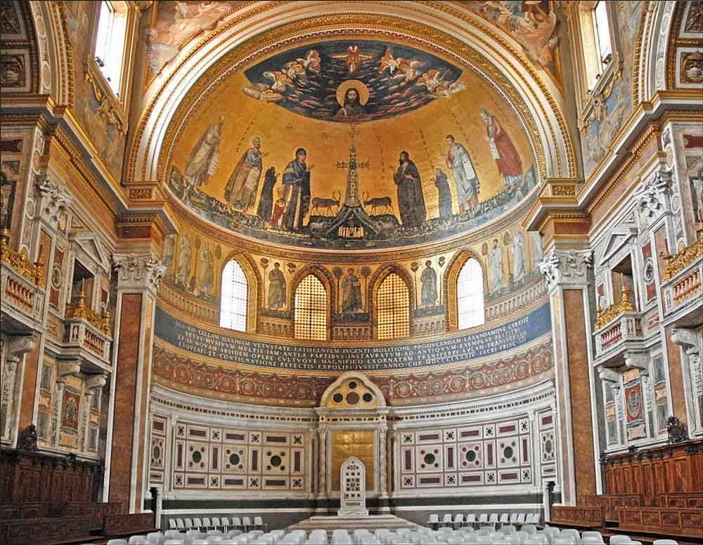 Осмотрев «нижний» храм, поднимаемся в современную, «новую», 12 века, базилику. Ее еще называют средневековой. Выполнена в раннехристианских традициях. Житийные фрески – мученичество св. Климента, которого выбрасывают в море привязанным к якорю; Траян приговаривает св. Игнатия Богоносца к растерзанию зверьми и мученичество на арене. Под главным алтарём маленькая часовня, где находятся мощи этих святых. В куполе апсиды грандиозная по размерам мозаика 12 века (есть предположения, что ее перенесли из «нижней» базилики или повторили мозаику 4-5 веков). В центре Распятый Спаситель на Кресте. Из Креста произрастает виноградная лоза и простирается по всей мозаике; в ее ветвях птицы, цветы, люди. Раннехристианская символика везде: рыбы, голуби (души в виде голубей поднимаются в Царствие Небесное по мосту, соединяющему небо и землю); Чаша – символ Евхаристии. Олени и лани пьют из источника живой воды. Древо жизни. Овцы окружили несущего крест Агнца. Птица-феникс - символ победы Христа над смертью. Очень впечатляюще! Базилика Святого Климента – это место, обязательное для паломников!