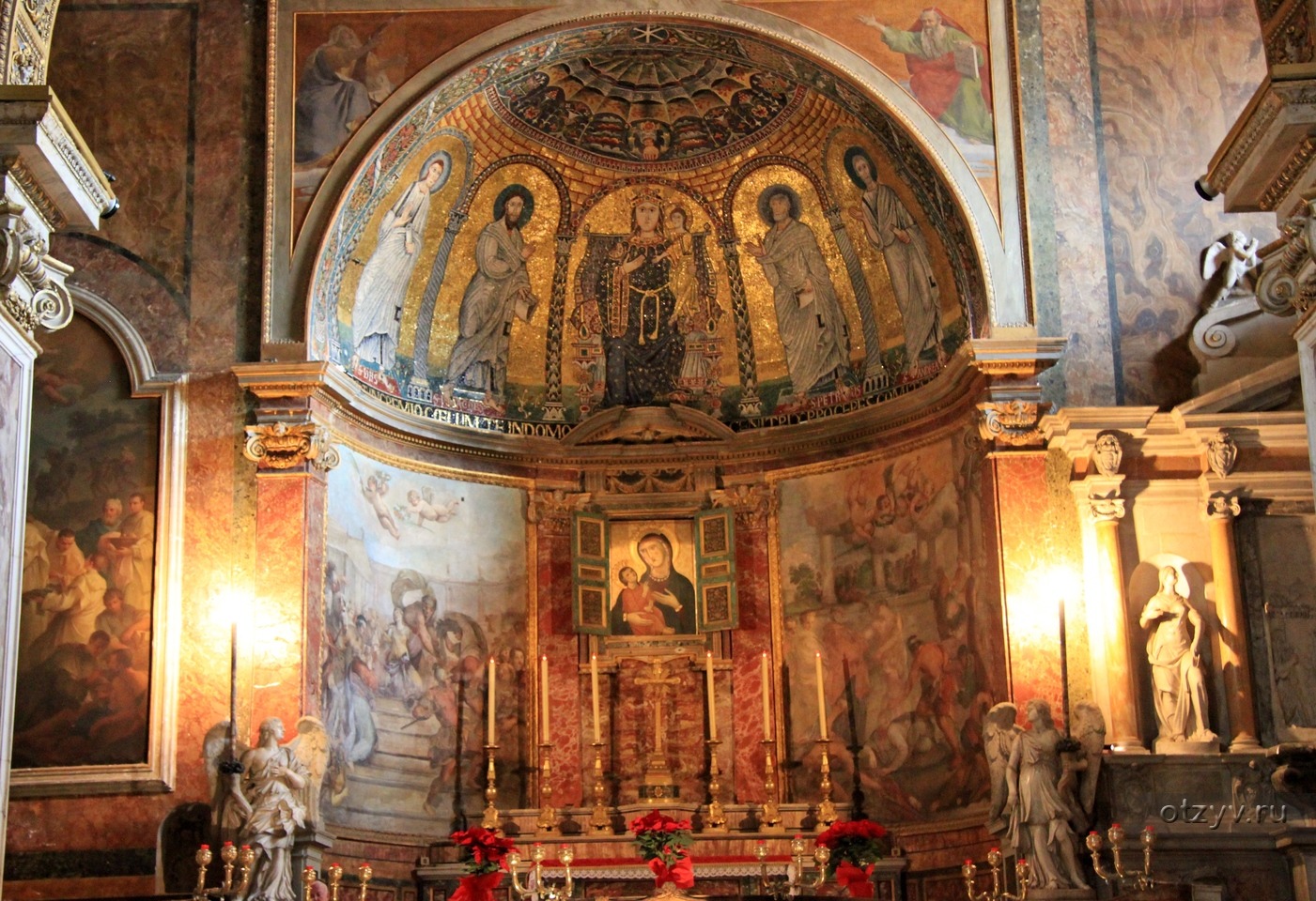 Это папская базилика, одна из четырех главных храмов Италии. Мы отметили, что римские большие храмы напоминают наши петербуржские соборы: Троицкий в Александро-Невской Лавре, Казанский и другие. По преданию, в IV веке Папе Либерию и богатому аристократу приснился один и тот же сон - им явилась Богородица и повелела построить церковь на том месте, где назавтра выпадет снег. Дело было в разгар летней итальянской жары, но, о чудо! – утром 5 августа 352 года Эсквилинский холм был укутан снегом! Базилику построили. Многие Папы в дальнейшем достраивали и украшали эту очень почитаемую римскую церковь, но, к счастью, несмотря на переделки, раннехристианская базилика все же доминирует, удивляя своей торжественностью, совершенством, гармонией. Поражает средневековый мраморный пол в декоративном стиле - его сюда перенесли из императорского дворца. Колонны из коринфского порфира. Великолепные мозаики XIII века. В одной из капелл (часовен) базилики - Сикстинской, впечатляет скульптура Папы Сикста V: приклонив колени, он молится Младенцу перед Святой колыбелью. Часовня посвящена Рождеству Христову, о чем рассказывают сюжеты росписи и мозаики.