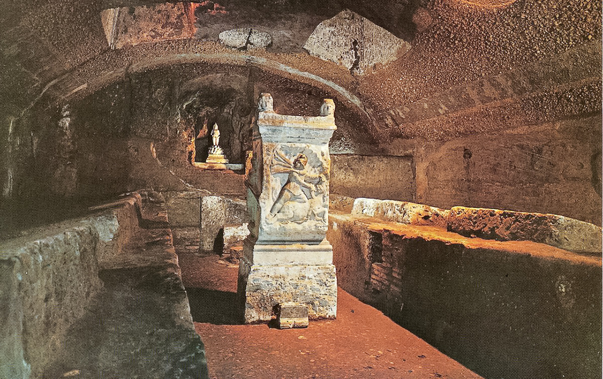 Входя, мы попадаем в средневековую церковь 12 века, затем по лестнице должны были спуститься ниже. Но! Мы не учли того, что существует фиеста и в дневное время храм на три часа закрывают. Нам пришлось прийти в базилику Сан-Клементе еще раз, и мы сразу же направились в самую нижнюю часть. Спускаемся по ступеням – и оказываемся в языческом храме Митры 2-3 веков и нескольких зданиях римского времени правления императора Домициана 81-96 гг.! От языческого святилища сохранился вход (пронаос), центральная часть храма (триклиний) – длинный грот с потолком, украшенным звездами, в центре которого расположен мраморный алтарь с изображением Митры, убивающего быка, за алтарем – его статуя, а вдоль стен мощные каменные лавки.