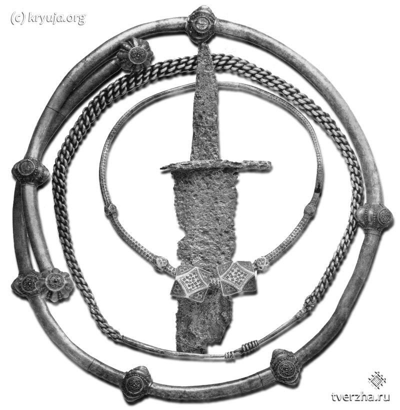 11. Серебряные шейные гривны и обломок каролингского меча из клада 1867 г., найденного при строительстве железной дороги на Центральном городище. Фото взято из открытых источников. Хранится в Петербурге, в Эрмитаже