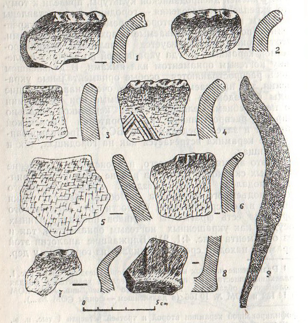 3. Находки IV–VII вв. н. э. из культурного слоя Центрального поселения и из верхнего горизонта материка под курганной насыпью № 106 Лесной группы Гнездова. Рисунок Е.А. Шмидта