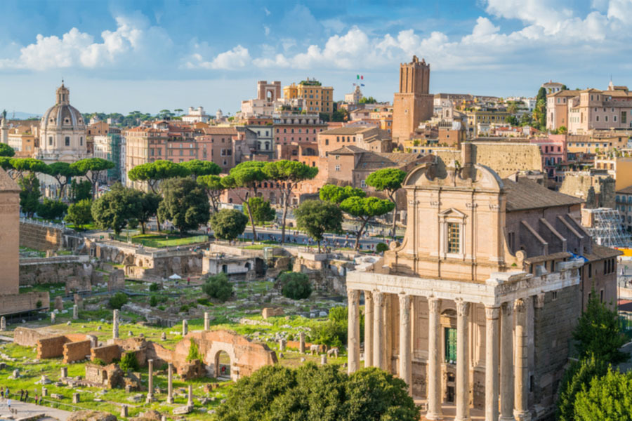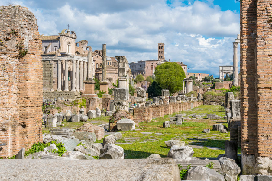 Не так много сохранилось от величественных храмов. Мраморный храм Пуп города утрачен. Несколько белоснежных колонн осталось от храма Весты (весталки поддерживали огонь в храме и проводили обряды в честь богини домашнего очага). Храм Цезаря был построен на месте, где сожгли тело Юлия Цезаря. Недалеко от храма располагается триумфальная арка Августа в честь императора Октавиана Августа. В величественном храме Сатурна, который строили в память победы над этрусским правителем, некоторое время находились казначейство и налоговая служба. Храм диоскуров (детей бога Юпитера) можно опознать по трем колоннам, называемым «Три сестры».