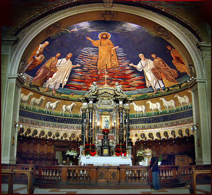 С появлением христиан на Форуме строилось множество церквей, многие здания были устроены под храмы: церковь Св. Адриана в помещении курии; церковь Санта-Мария-ин-Каннапара в базилике Юлии; Санта-Мария-ин-Миранда в храме Антонина и Фаустины; Сан-Сальваторе-де-Статера в бывшем храме Сатурна. Рядом со Священной дорогой, построенной в 5 веке до н.э., была построена церковь св. Вакха и св. Сергия. Мы побывали в двух храмах Римского форума - Санта-Франческа-Романа и святых Космы и Дамиана Аравийских. Санта-Франческа-Романа - средневековая церковь, построенная на месте большого античного храма 2 века, посвященного богиням Венере и Роме (покровительницы древнего города). Есть предание, что Симон Волхв, желая показать свое превосходство над апостолом Петром, поднялся с помощью магии в воздух. Св. Петр стал на колени и стал истово молиться. Симон был посрамлен – упал и разбился. А на том месте, где молился св. Петр, остались следы от его колен. Плита с отпечатками хранится в этой церкви. Под алтарем были найдены мощи св. Франциски Римской. Эта святая особо почитается римскими водителями, они считают ее своей покровительницей и ежегодно в день ее памяти собираются здесь для молитвы. В церкви св. Франческа находится древняя икона Божией Матери VI века, а в раковине алтарной апсиды удивительная мозаика 1161 года с изображением Богородицы с Младенцем в окружении апостолов. Этот храм также очень популярен для проведения свадеб.
