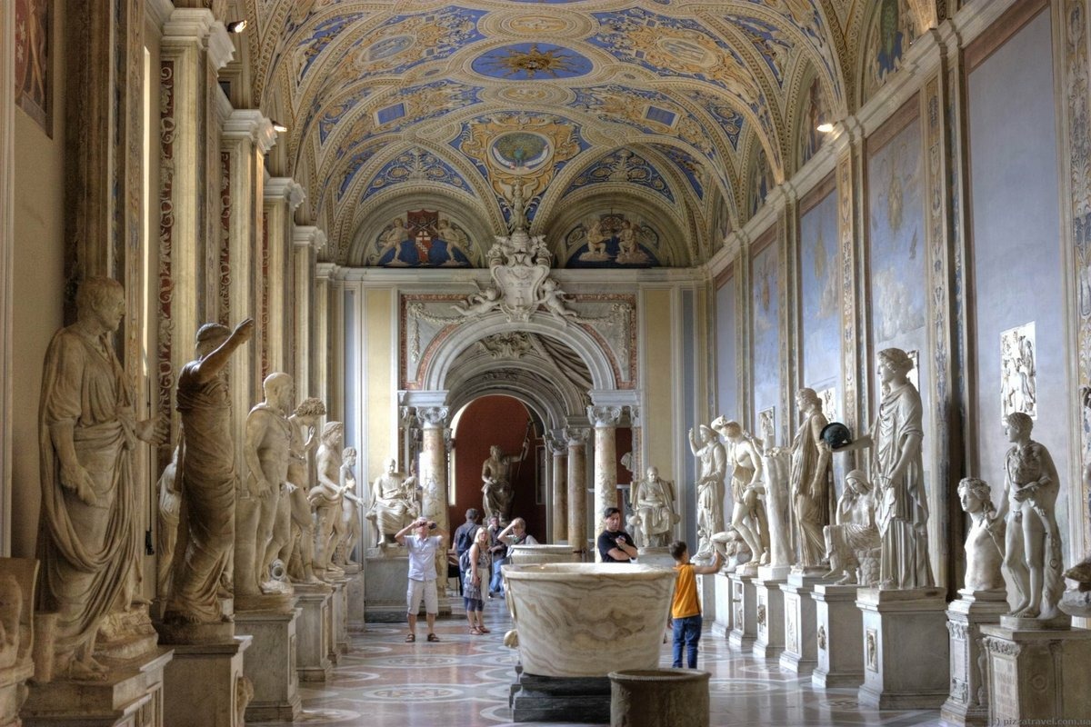 В Бельведерском дворце разместился музей античных скульптур - огромная коллекция, несколько сотен экспонатов. Саркофаги (на одном из них запомнилось изображение амазонок), купели, барельефы. Запомнилось, что когда умирал второй супруг, то его хоронили в том же саркофаге, в котором был похоронен первый супруг. Саркофаг, в котором была захоронена первоначально мать императора Константина Елена и второй, где его дочь Констанция. Погребальные украшения, свитки, мумии, священные статуэтки, жуки-скарабеи. В центре зала, напоминающего Пантеон, установлен бассейн Нерона - огромная чаша из красного порфира. Всемирно известные статуи Аполлона и Гермеса, Лаокоона с сыновьями и Персея. Бронзовая позолоченная статуя Геркулеса (II век н.э.). Папа Павел IV, возмущаясь видом множества обнаженных скульптур, приказал их оскопить, что и было исполнено (лишь одной удалось этого избежать - Папа недосмотрел).