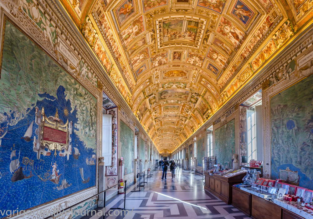 Далее идем по галерее географических карт. Это крупнейшая в мире серия фресок, изображающих карты. Длина галереи 120 метров. 40 фресок размером 5 с половиной на 6 с половиной метров с подробными деталями регионов Италии, островов, городов и каких-то значимых событий. И это было создано тогда, когда не было ни спутников, ни съемки с высоты! Полтора года шла работа, с 1580 по 1583 год. Воинство Юлия Цезаря, переходящее реку Рубикон, победная битва Карла VIII с французами при Форново… Разглядывая карты, можно представить, как выглядела Италия и ее основные города в то время. Поражает уровень детализации: замки, церкви, деревья, лодки на воде, горы. И даже из раздела фантастики и язычества – морские существа, Нептун. А на золотом потолке галереи уже небесное: над картой определенного региона размещено религиозное событие, происходившее здесь, например, над Миланом – святой Амвросий; над Калабрией – святой Франциск; Михаил Архангел над Апулией, где его почитают в знаменитой пещере в Гаргано и т.д. Этим как бы подчеркивается Божие покровительство над землей Италии. И еще интересный факт - в XVI веке Италия, как единая страна еще не существовала, но на картах воедино собраны изображения всех ее регионов с центром в Риме. Фактически же объединение итальянских регионов началось только в XIX веке.