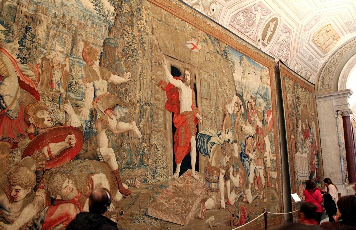 К главной капелле мира – Сикстинской - мы шли по галерее Арацци, стены которой украшены гобеленами, созданными учениками Рафаэля. Убиенные Вифлеемские младенцы, гобелен с изображением убийства Юлия Цезаря. Особенно поразил гобелен "Воскресение Христа", с которого Господь смотрит на вас, где бы вы не находились, Он буквально поворачивается за вами, пока вы идете по галерее, встречает и провожает вас.
