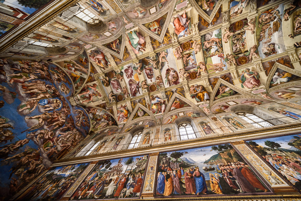 Возможно, что благодаря противостоянию опытного и молодого гениев мир увидел роспись Сикстинской капеллы - самого знаменитого музея Ватикана и мира. Расписывал ее сам (в смысле – один, без помощи: «я нахожусь в полном одиночестве и тяжелом физическом труде, и ни друзей и никого другого рядом не желаю») Микеланджело Буонарроти, будучи до этого известным как скульптор. Работал 4 года. 600 квадратных метров – именно такая площадь была покрыта изображениями. Самое сложное – потолок. Художник расписывал его, лежа на спине на придуманных им же «летящих» лесах (благодаря этому в капелле не прекращались богослужения и во время работ). 1000 кв. метров свода, около 300 различных фигур. До Микеланджело никто не создавал работ такого масштаба. После росписи потолка, художник сказал, что с живописью покончено, и лишь спустя 20 лет его уговорили вновь взяться за кисть для росписи «Страшного Суда» на алтарной стене Сикстинской капеллы. Восемь лет писал он эту знаменитую фреску, работа давалась ему очень тяжело, через «надрыв». Возможно, это он хотел показать написанием своего автопортрета в виде святого мученика Варфоломея, с которого живьем содрали кожу. Изначально все фигуры на фреске были обнаженными. Но взошедший на престол Папа Павел IV потребовал, чтобы Микеланджело привел их в «приличный вид». Художник отказался это сделать, сказав, что сначала надо в приличный вид привести весь мир. Он считал, что всё истлеет и на Страшный Суд все предстанут обнажёнными. Набедренные повязки дорисовывал ученик Микеланджело, который вошел в историю под прозвищем «штанописец».