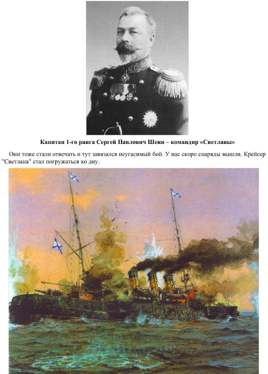 Во время гибели «Светланы» командир ее, капитан 1-го ранга Сергей Павлович Шеин, и старший офицер капитан 2-го ранга Алексей Александрович Зуров, решили не покидать тонущий крейсер. Судьба послала им смерть раньше. Зуров был убит во время последнего обхода помещений крейсера, а командир был ранен, а потом убит на верхней палубе. За несколько минут до того, как «Светлана» в 11 часов утра навсегда скрылась в холодных волнах Японского моря.