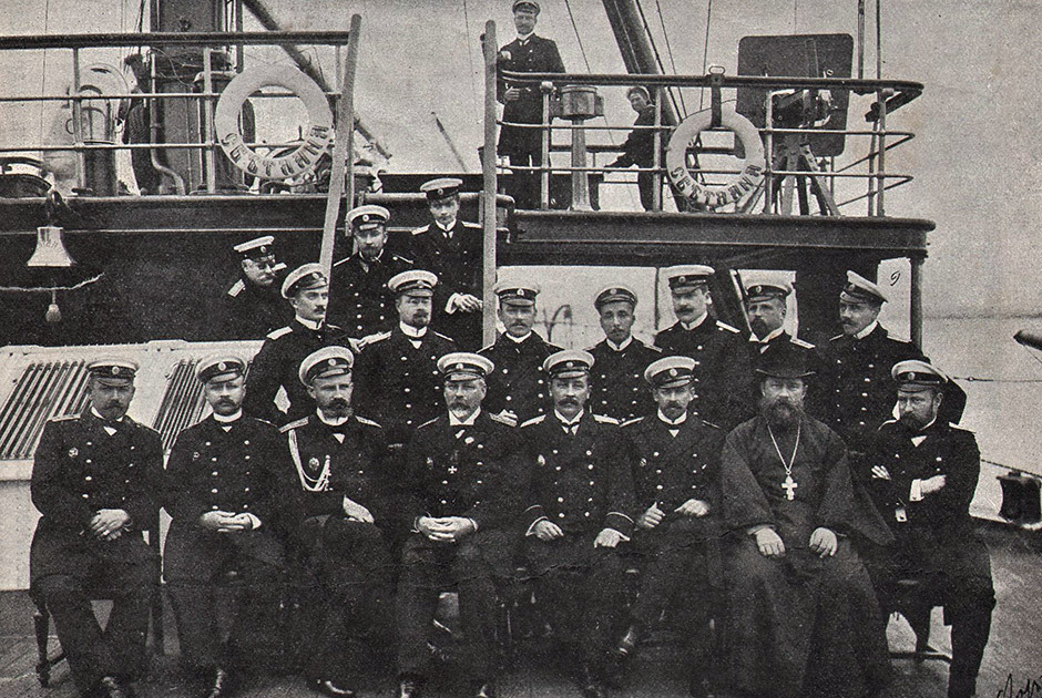 В первом ряду − третий слева − А.А. Зуров, четвертый − С.П. Шеин. Второй справа − иеромонах отец Федор (Хандалеев), любимый батюшка крейсера. Вверху на мостике стоит лейтенант А.В. Вырубов, верхний на трапе – мичман граф Г.М. Нирод.