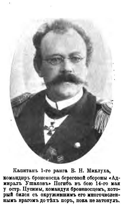 «Так погиб в Цусимском бою 15-го мая 1905 года броненосец береговой обороны "Адмирал Ушаков" и его командир капитан 1-го ранга В.Н. Миклуха, а с ним старший офицер капитан 2-го ранга Мусатов, минный офицер лейтенант Жданов, старший механик капитан Яковлев, младший механик поручик Трубицын, младший штурман прапорщик Зорич, комиссар чиновник Михеев и около ста матросов.