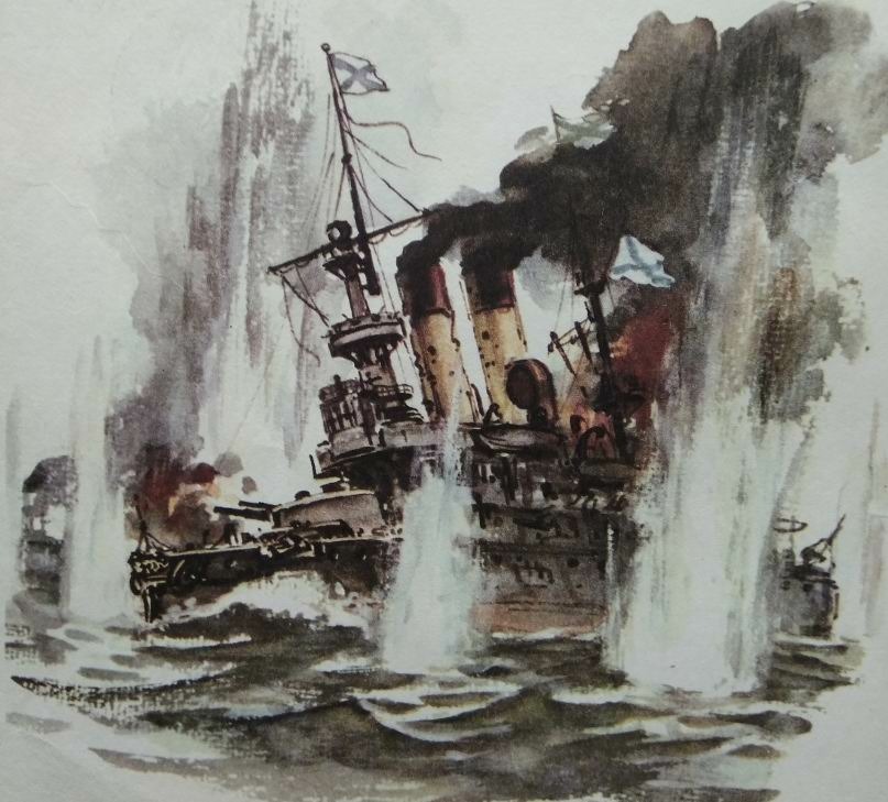 Окружили нас неприятельские миноносцы. Тут наши крейсера открыли огонь со всех орудиев, а также и броненосцы. Раздался гром по всему морю. Наши крейсера "Олег", "Жемчуг", "Изумруд", "Аврора" пошли прямо на миноносцы. Тут они почти все миноносцы перетопили.